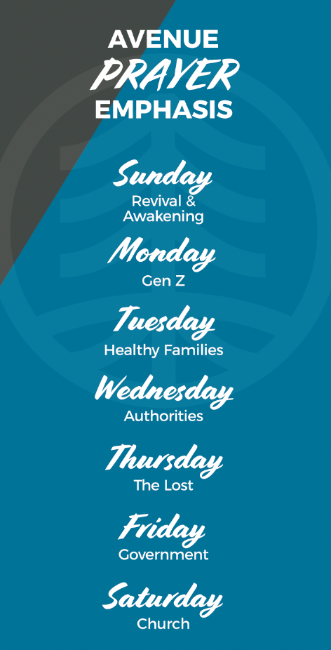 Monday- Pray for the Students and Children of our church and beyond. Using the acronym GENZ, pray for the students to Grow in love for Jesus, the boldness and brokenness to Engage unbelievers with the gospel, wisdom to Navigate this world with God's truth, and Zeal for revival and spiritual awakening.