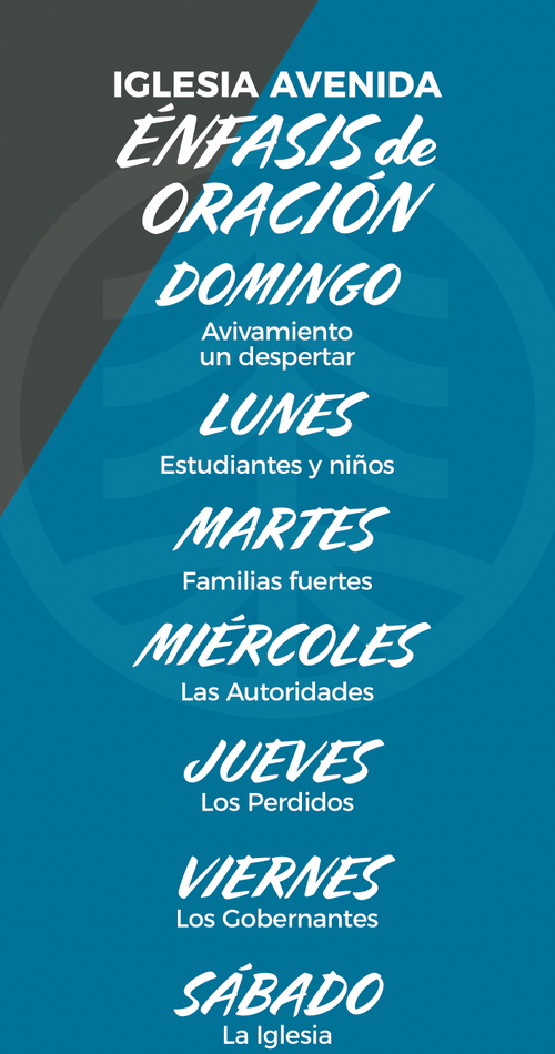 Lunes: Ore por los estudiantes y niños de nuestra iglesia y más allá. Ore para que los estudiantes crezcan en su amor por Cristo.Ore para la audacia y el quebrantamiento en compartir el evangelio con los incrédulos. Ore por su sabiduría para navegar por este mundo con la verdad de Dios. Ore por su entusiasmo por el avivamiento y el despertar espiritual.