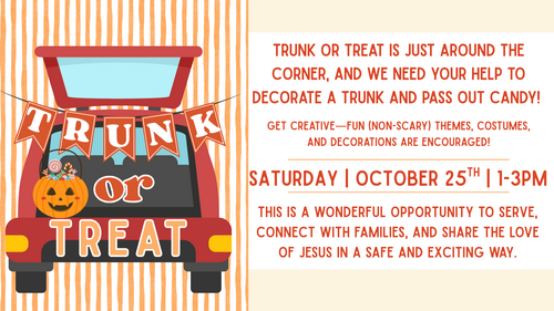 🎃✨ Share the love of Jesus (and candy too!)—sign up to decorate your trunk for our Trunk or Treat outreach! Please keep decorations fun and family-friendly—no spooky themes. 🚗✨